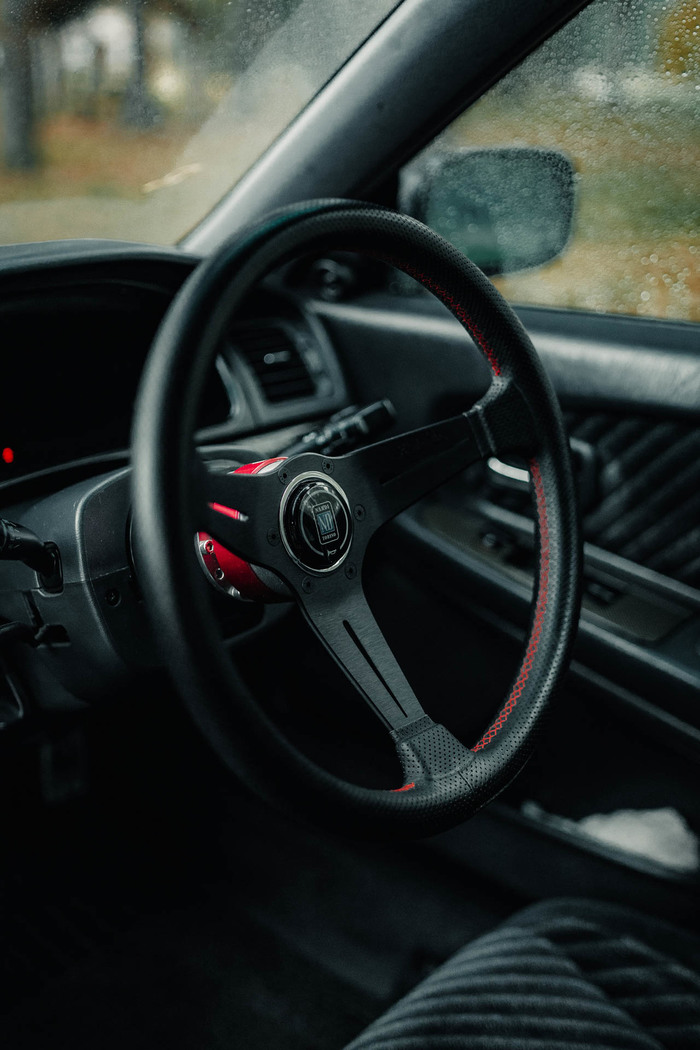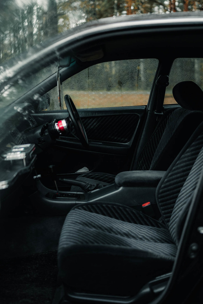 Салон просто хорошо ухожен и выглядит весьма свежо для 22-летней машины. Дополнительно были установлены отдельные детали интерьера: это спортивный оригинальный руль Nardi Deep Corn, в комплекте с быстросъемом D1 Spec и оригинальный японский столик, встающий без переделок в штатное место.