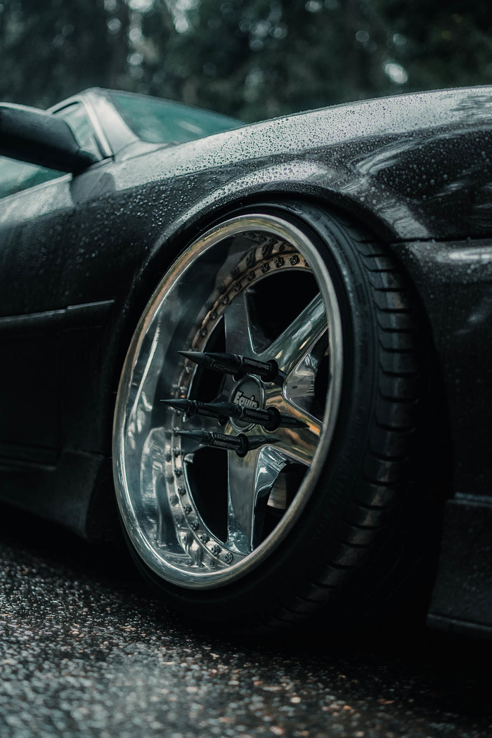 Чтобы получился жизнеспособный на дороге автомобиль пришлось полноценно заняться подвеской. Койловеры использованы BC Racing серии DS, пружины 24 кг/мм, регулируемые рычаги Cusco, отрицательный развал (-6.5° спереди и -8.5° сзади), грамотная настройка и многорычажная подвеска показывает себя во всей красе: при наезде на неровности колесо, как и положено, уходит в арку.