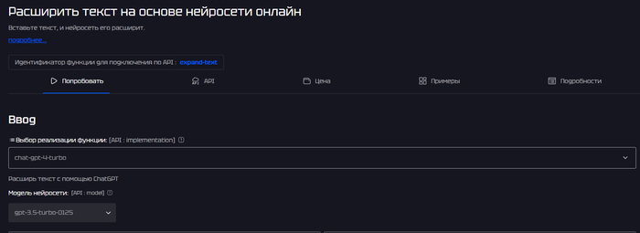 Вы вставляете текст, при желании включаете перефразирование, добавляете свои указания — и сервис аккуратно раздувает материал, подкидывая контекст и формулировки. Мне нравится, что тут можно выбирать реализацию под разные модели и управлять креативностью (temperature), поэтому продолжение легко сделать более строгим или более живым. Плюс это удобно, если вам нужно автоматизировать дописывание: у функции есть идентификатор для подключения по API.