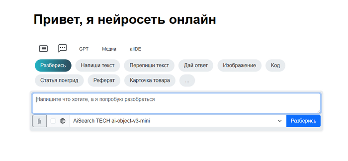 Форматы: продолжение текста, рерайт, план/структура, чат-режим