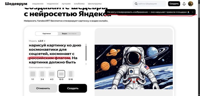 А вот что мне по почти идентичному запросу ("нарисуй картинку ко дню космонавтики для соцсетей. На картинке должно быть пустое место для текста") выдал Шедеврум.