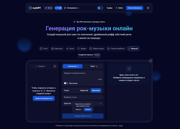 Важно: Suno не может имитировать конкретных артистов по имени (это запрещено), но может создать музыку "в стиле драматичного рока с мужским вокалом" или "в духе современного хип-хопа". Это защищает от проблем с авторскими правами, но при этом даёт огромную творческую свободу.