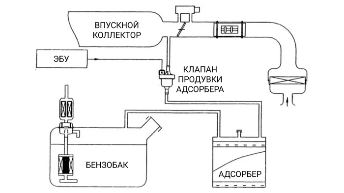 Вернее адсорбер не продувается двигателем, а просасывается, ведь двигатель именно сосёт воздух из адсорбера, а не дует в него.