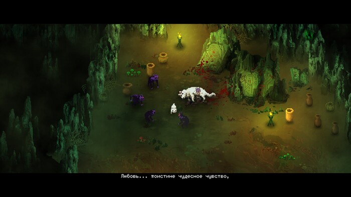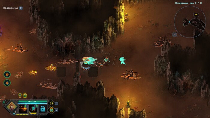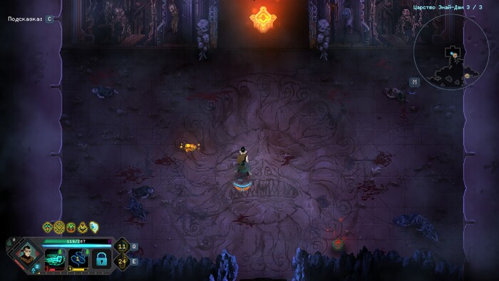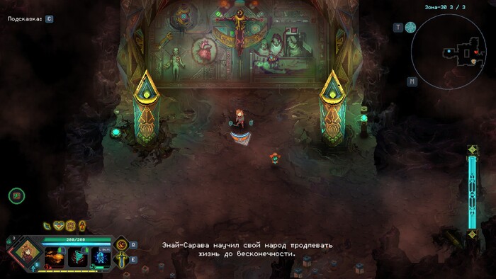 Вторым большим достоинством я бы назвал инновационный подход к подаче сюжета. Возможно, люди, лучше разбирающиеся в вопросе, поправят меня, но обычно в рогаликах сюжет – это вторичный элемент. Мы идем на круг, прогоняем его, добившись успеха, или умерев в процессе, возвращаемся на базу, получив опыт, ресурсы, деньги, и т.п. Продолжаем.