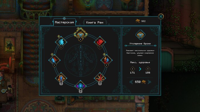 Как я и говорил раньше, по возвращению из данжа нам предстоит тратить бабло на один из двух типов улучшений. Либо повышать характеристики бойцов, либо – грейдить разные пассивки вроде количества дропа голды с крипов или степени эффективности разбросанных по уровням алтарей с баффами.