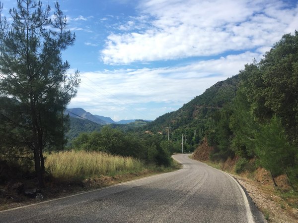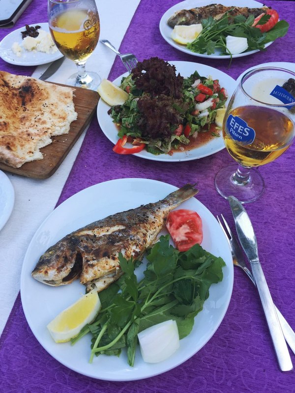 После я отправилась еще немного поспать, по пробуждении как всегда был отличный завтрак с кофе, арбузом и прочими вкусняшками. И солнце светило вовсю, и тучки куда-то делись. Так что мы собрались и почти на весь день утопали на пляж, в южную его часть, ближе к Олимпосу. Взяли по пути вина, лепешек гезлеме (офигенные они, мне очень понравились, со всякими начинками), какие-то забавные консервированные баклажаны – отличный пляжный перекус. И вот в этой чудесной бухточке провели несколько часов – валялись, пили вино, плавали с маской, разгоняя рыбок (видели даже несколько прикольных ярких)