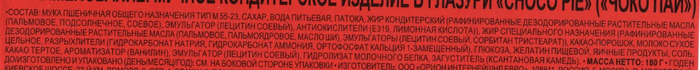 Состав: мука пшеничная общего назначения тип М55-23, сахар, вода питьевая, патока, жир кондитерский (рафинированные дезодорированные растительные масла (пальмовое, подсолнечное, соевое), эмульгатор (лецитин соевый), антиокислители (Е319, лимонная кислота)), жир специального назначения (рафинированные и дезодорированные растительные масла (пальмовое и пальмоядровое, масло ши), эмульгаторы (лецитин соевый, сорбитан тристеарат)), какао-порошок, молоко сухое, разрыхлители (гидрокарбонат натрия, гидрокарбонат аммония, ортофосфат кальция 1-замещенный), глюкоза, желатин пищевой, яичные продукты, соль, какао тертое, ароматизатор (ванилин), эмульгатор (лецитин соевый), гидролизат молочного белка, загуститель (ксантановая камедь).