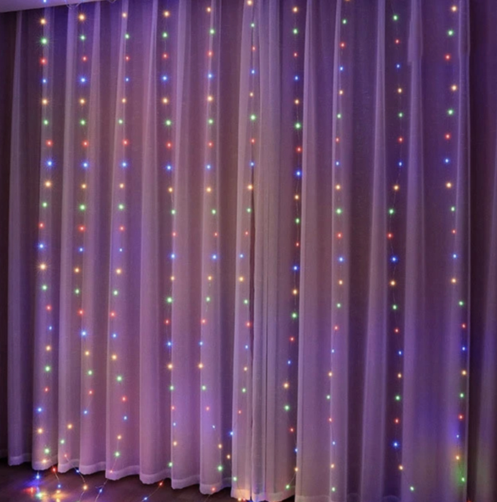 Световая штора формирует эффект искристого водопада и отлично подходит для декора стен, окон, арок и фотозон. Диоды дают ровный тёплый свет без мерцания, а гибкие нити легко размещаются на любой поверхности.