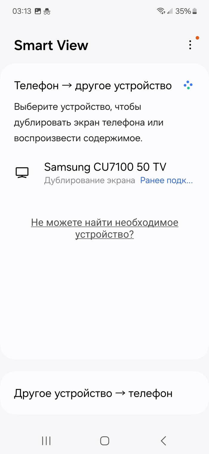 Телефон Samsung Galaxy S24. Телевизор Samsung CU7100 50 TV . Имеется функция Smart View. С телефона картинка на телевизор передается нормально. Еще есть функция "Другое устройство --> телефон". Из описания функции я понял, что картинка тв должна передаваться на экран телефона. Но, почему то в этом режиме телефон не видит тв. Как их подружить? 📺📱