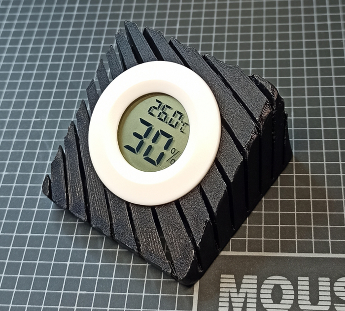 Как показывает многолетняя практика - если в пятницу не бухать, а лечь спать в 22:00, то на следующий день заняться нечем, особенно если погода плохая, да и вообще скучновато. Приходится выезжать на хоббях. А у меня как раз давно уже валяется гигрометр с Али, к которому так и просится сделать корпус. Корпус хотелось маленький, с прорезями для вентиляции и дьявольски красивый. Чтож... Берём Синьку, создаем кубик и отсекаем от него всё лишнее. После ряда извращений получилось такое вот нечто: