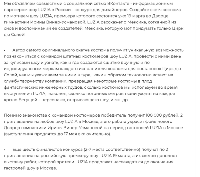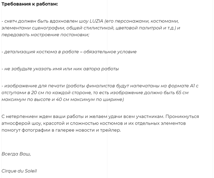 История получила своё продолжение буквально в прошлую пятницу, когда находясь на работе я наткнулся на рекламу в просторах интернета, что в нашем городе на 3 дня приехал тот самый цирк Cirque du Soleil. Тут мне вспомнилась давняя история про то, как несправедливо поступила с нами подрядная организация и, собравшись духом, решил написать им. Долго искал почтовый ящик руководителя цирка, но в контактах сайтов были указаны лишь номера телефонов региональных представителей. Наконец, решившись, позвонил российскому представителю. По телефону я пытался объяснить суть своего звонка, и на протяжении всего разговора я чувствовал всю нелепость ситуации и абсурда, но все же донес суть звонка)) На другом конце провода мне продиктовали e-mail и попросили изложить все в письменном виде. Далее было отправлено письмо следующего характера: