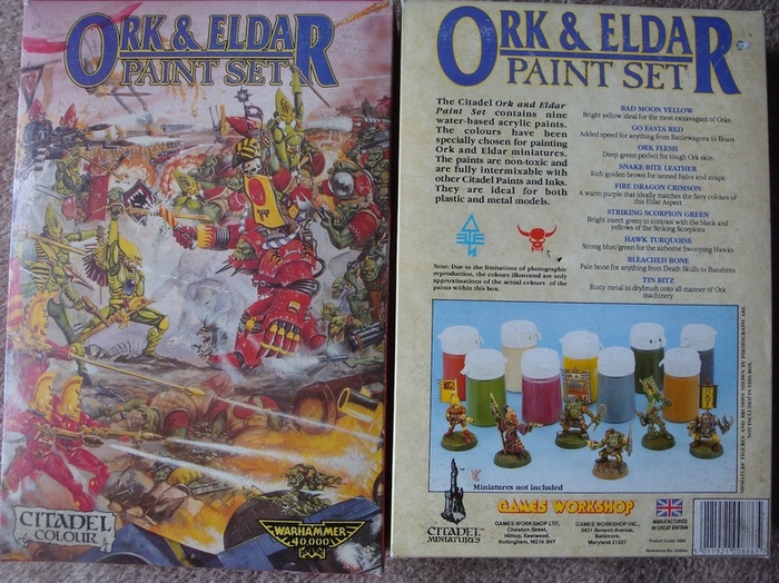 Затем, на стыке десятилетий появился набор красок для Орков и Эльдар. Как и в случае с прошлым набором, здесь были представлены новые оттенки, в большинстве своем для инопланетных сил: Bad Moon Yellow, Go Fasta Red, Ork Flesh, Snakebite Leather, Fire Dragon Crimson, Striking Scorpion Green, Hawk Turquoise, Bleached Bone и Tin Bitz. Этот набор так же совершил небольшую революцию в конструкции баночек для краски.