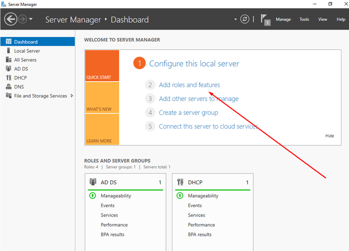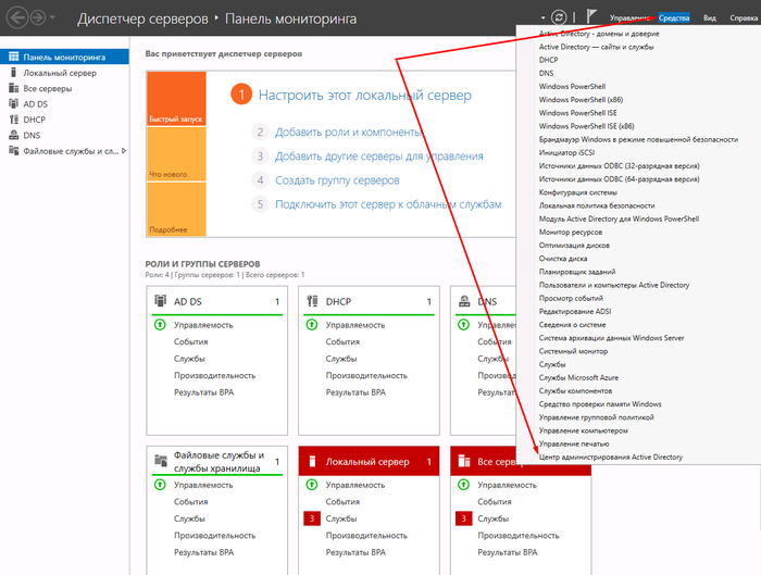В диспетчере серверов выберем «Добавить роли и компоненты». Отметим для установки DHCP-сервер, DNC-сервер и Доменные службы Active Directory. Отметим галочку «Перезагрузить автоматически».