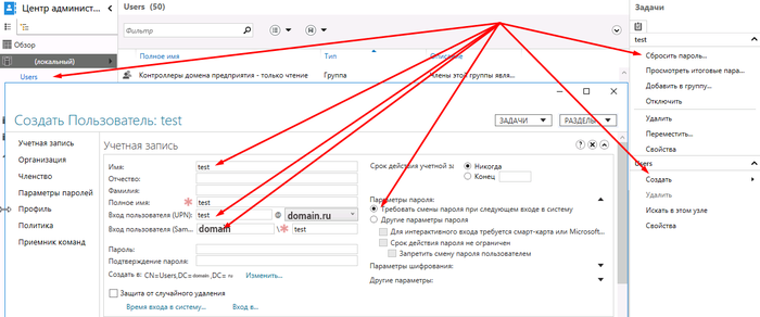 Выберем созданного пользователя и в вертикальном меню справа выберем «Сбросить пароль». Оставим галочку «Требовать смены пароля при следующем входе в систем».