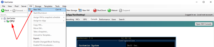 С помощью XenCenter создадим виртуальную машину с GPU. В вкладке «VM» нажмем «New VM».