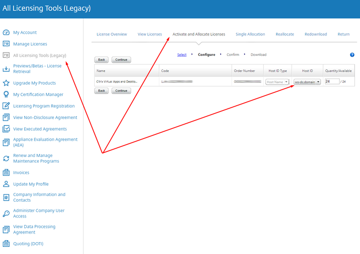 В вертикальном списке слева выберем All Licensing Tools (Legacy). Перейдем на вкладку «Activate and Allocate Licenses». Выберем лицензии Citrix VDA и нажмем «Continue». Укажем имя нашего Delivery Controllera — ws-dc.domain.ru и количество лицензий — 4. Жмем «Continue». Скачаем сгенерированный файл лицензии на ws-dc.domain.ru.