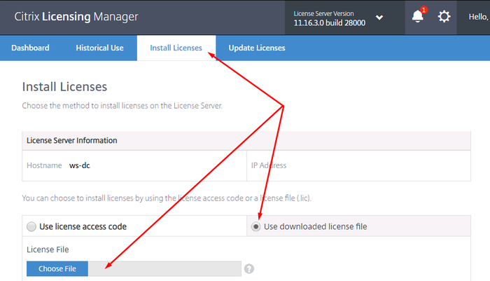 В Citrix Licensing Manager перейдем на вкладку «Install License». Для добавления файла лицензии нужно выбрать «Use downloaded license file».