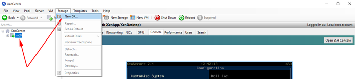 В XenCenter, после нажатия по имени добавленного гипервизора, будет доступна вкладка «Console». В меню выберем «Remote Service Configuration» и включим авторизацию по SSH — «Enable/Disable Remote Shell».