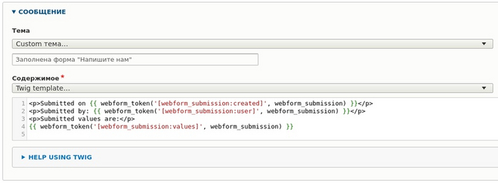 Тема и содержимое сообщения. Особое внимание к Twig — он позволит более или менее оформить письмо.