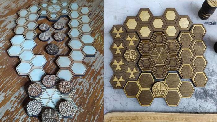 Для меня это был первый крупный проект, связанный с лазерной резкой, благодаря которому удалось [пришлось] закапываться в изучение некоторых особенностей работы станка. И это было в кайф. Всё от прорисовки рож до вычитывания правил.