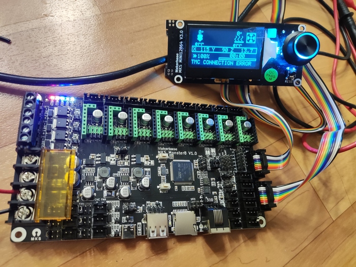 Это реально монстер, плата пришла с прошивкой марлин под 3D принтер voron 2.4. 8 драйверов ТМС 2209. У стоковой прошивки было 4 оси Z, а мне нужно было добиться 2 мотора (оси) по X, два по Y, и один по Z. Пришлось быстро осваивать марлин, Visual Studio Code и github. За образец я взял прошивку от skr и прям по строчно заменил всё в дефолтной, естественно с указанием чипа от монстра. Подкинул моторы, зашел в меню, и привел их в движение. Всё работает. Драйвера умеют работать в режиме uart, но автор станка, рекомендовал использовать физические концевые датчики. И вот тут возникла проблема. Концевики "не взлетели", даже выключение uart и отгибание ножки на драйвере, изменение перемычек, не дало нужный результат... Решил запускаться пока без концевиков.