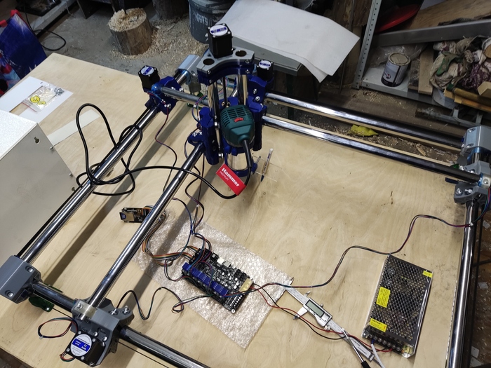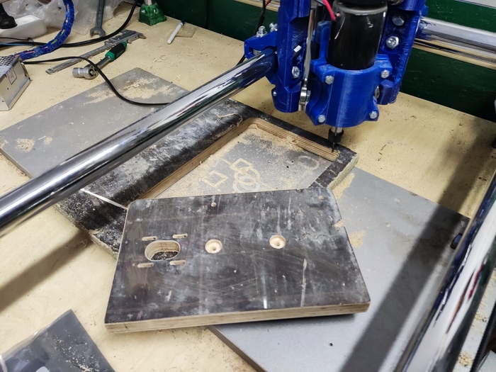 Но и тут концевики "не взлетели", точнее они работают, но не работает команда "Домой X и Y", станок делает перемещения от нуля на 1 мм по каждой оси и останавливается, включение выключение всяких режимов драйвера толку не дали. Какой я нашел пока выход? Всё просто G92 X0 Y0 Z0. Я его в меню продублировал, и когда делаю файл с g-code добавляю первой строчкой. Решение оказалось на столько удобным, что сейчас думаю а нужны ли мне вообще концевики? Шпинделя у меня два, под разные хвостовики фрез, поэтому их провода не стал укладывать в кабель канал. А это станок в работе, фрезеровка стенки и запрессовка подшипников. Это для другого станка, но об этом расскажу в другой раз.