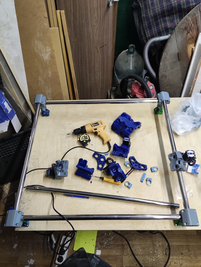 Почитав описание, кстати, очень подробно все расписано, сколько каких болтов и гаек, сколько подшипников, модели для 3D печати сразу для нескольких типов труб. Так же есть калькулятор расчета размера портала, задаем рабочую площадь, и он сразу выдает спецификацию, какой длинны и сколько штук, надо нарезать трубы. В идеале нужна дюймовая нержавейка с толщиной стенок 1,5 мм. К сожаленью найти такой не удалось. Поэтому выбор пал на обычные хромированные трубы толщиной 1 мм от системы joker. Купил две трубы по 3 метра, на калькуляторе посчитал поле чтоб не оставалось обрезков, получилось рабочее поле 500 х 600 мм. Прикинул провисание самой длинной трубы в середине максимально составит 0.4 мм. Следующая проблема, 3D печать, оказалось что ни у кого из знакомых и друзей нету принтера. Печатать на заказ, местные, заламывали такие ценники, что дешевле было купить готовые у v1 engineering, на авито готовый набор деталей начинался от 9 тыс + пересылка. Тогда я решил посмотреть сколько стоит простой 3D принтер, способный распечатать нужные детали. Случайно на али, попался kingroon kp3s, была какая то акция, еще случайный купон со скидкой... принтер обошелся чуть меньше 10 тысяч рублей. В 3D печати опыта нет вообще. Как оказалось это целая наука. Постепенно начал разбираться и изучать. Изначально предполагалось распечатать все детали из пэт бутылок, но после того как слайсер оценил печать ядра в 200 метров прутка и 20 часов печати, подумал что нужен фабричный petg. Купил две катушки. Ядро единственная деталь, которая требует 70% заполнения, и то середину можно печатать с 45% заполнением. Остальные детали автор рекомендовал от 45%.