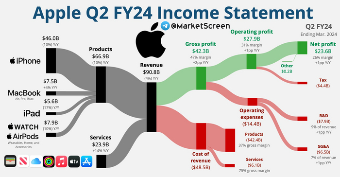 Основные денежные потоки идут от продаж Айфонов - 46 млрд $. Тут, кстати, снижение на 10% за год. Дальше «Услуги» - 23,9% и рост на 14%. Больше всех упали Айпады - минус 17% за год и 5,6 млрд $ за квартал.