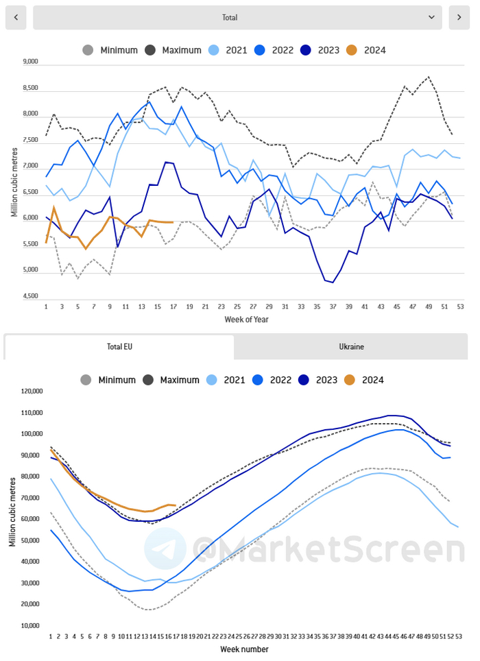 Ничего нового. Уже три недели практически без изменений по недельным объёмам. Российские поставки стабильны - чуть выше 600 млн.куб.м. В очередной раз повторяю - это трубопроводные поставки. Структура «страны СПГ» раскрывается синк-танком Bruegel раз в месяц.