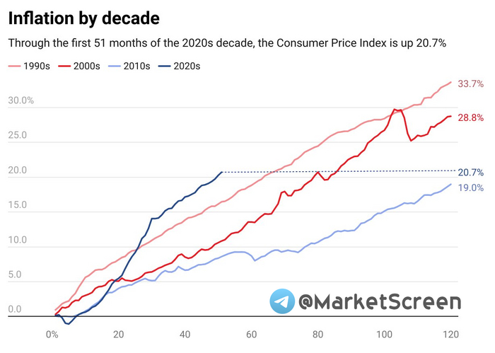 Так выглядит инфляция в граде на холме, если разбить по десятилетиям. То есть сейчас за 51 месяц текущего десятка они уже обогнали итог прошлого. Есть шансы опередить и двухтысячные, и девяностые.