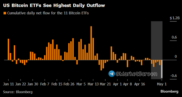 В США наблюдается самый высокий ежедневный отток средств из биткоин-ETF. Инвесторы вывели 564 миллиона долларов из 11 спотовых биткоин-ETF в среду.