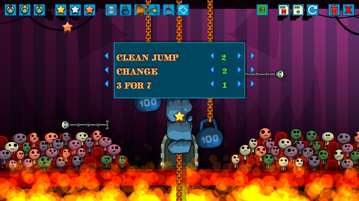 Кто не уловил, в чём игра. Суть в том, чтобы, раскрутив трапецию, прыгать rag-doll клоуном, совершая всевозможные трюки, которых в игре порядка 30. Выполнение первой партии трюков открывает дверь и выставляет на поле бронзовую звезду, которую ещё надо взять. Последующие наборы — серебряную и золотую. Понятно, что трюки усложняются. Для, собственно, уровней в игре есть удобный встроенный редактор уровней. Мешать свободному полёту персонажа будут: