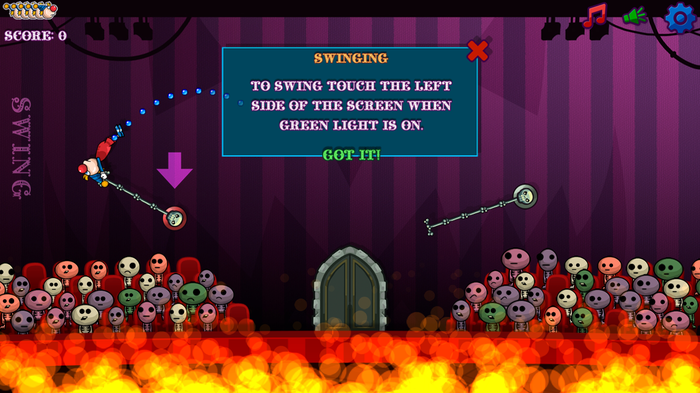 Всего в игре можно умереть 5-ю различными способами (включая один секретно-неочевидный). Совершив прыжок, клоун отправляется в полёт. В полёте им тоже можно ограниченно управлять, «дёргаясь» в стороны. Зацепляется за трапецию клоун автоматически или руками или ногами. На этом тоже основан ряд трюков. Также в игре есть заблокированная возможность slo-mo, когда при удержании «прыжка» всё замедляется, персонаж подсвечивается прожектором и прыгнуть становится гораздо легче. Именно поэтому она и была выпилена, из-за того, что игра делается лёгкой, а задизайнить что-то разумное по этому поводу у меня не хватило творческого угара.