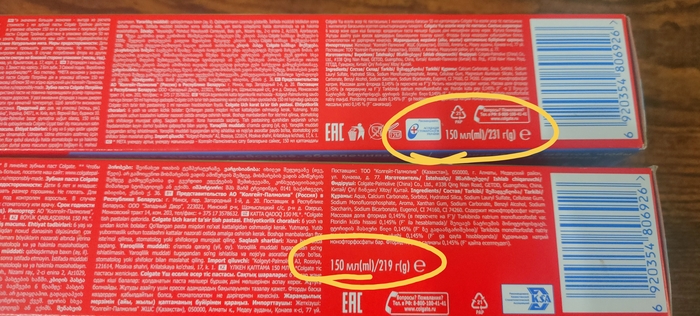 2 упаковки зубной пасты,одна куплена в 2022 другая в 2025,что интересно вес потеряли объем по заявлениям производителя остался неизвестный)))