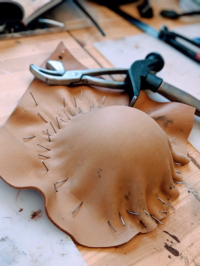 Малый наплечник я планировала делать из кожи. Я закупила толстую кожу растительного дубления и вытянула ее по форме