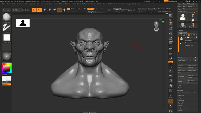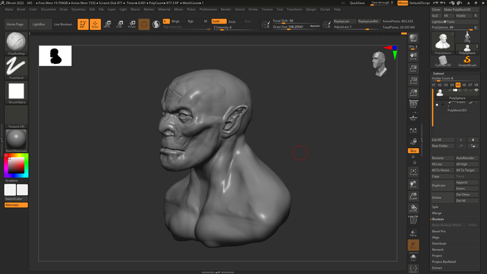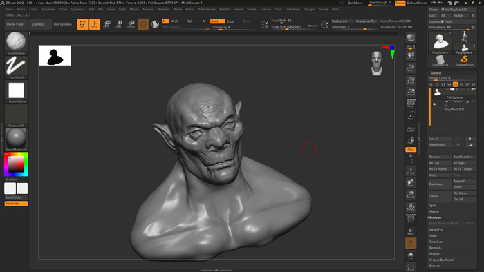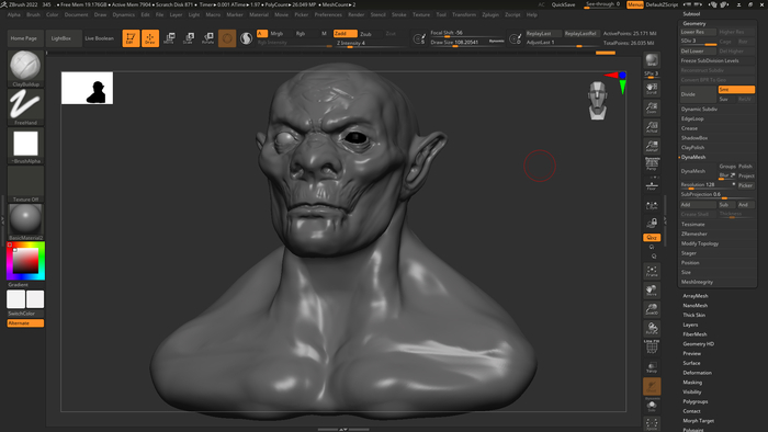 Пробую поучиться в такой проге как Zbrush. Довольно тяжело даётся после макса. Урок кстати с гиперкорявым переводом. Интерфейс и навигация это отдельная тема). С глазами косяк, так и не понял, почему один покрасился и почему Divide не применяется сразу к 2м. Чёт так и не нашёл где симметрия отключается. (не гуглил). Ну и традиционно, панамка открыта)