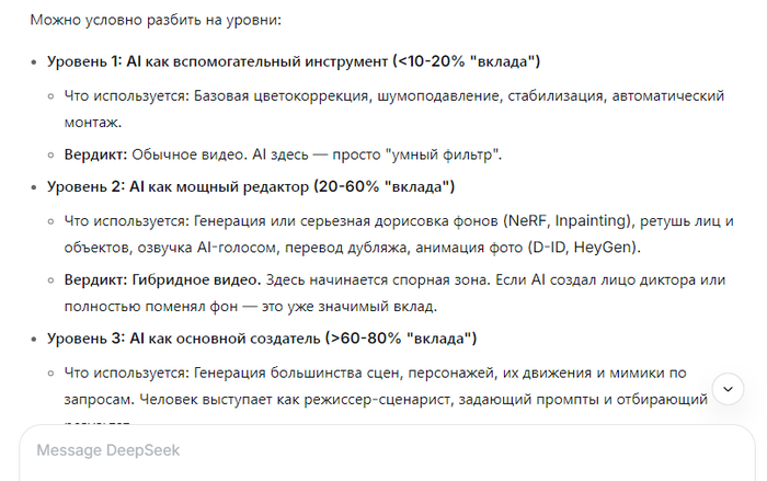 Этот вопрос я задал 6 ИИ. Логически даже самим ИИ не нужен слоп https://t-j.ru/ai-slop/ ибо тогда они низким качеством позорят сами себя. Нейровидео ли ролик с котом Вася, который обработан встроенным ИИ с фильтром любого смартфона на 2%? А если на 15%? И это ведь уже происходит с любыми съёмками, хотя есть и специнструменты - https://dzen.ru/a/Z6vgmS30o3VYNPq9