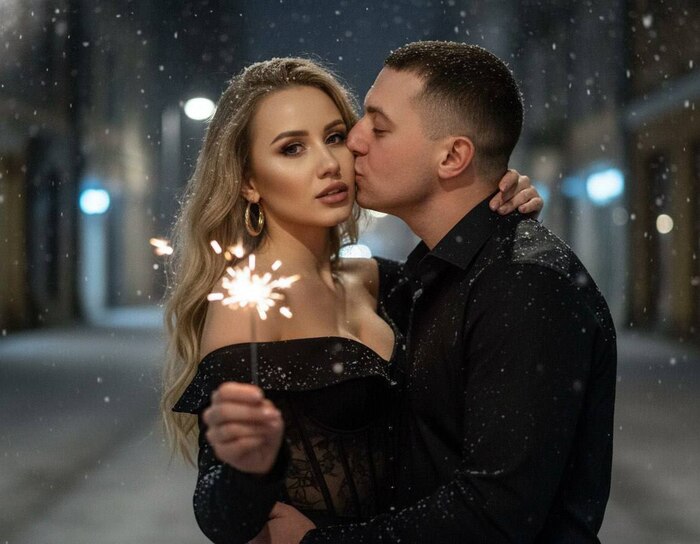 Создай портрет, не меняя черты лица. Кинематографический стиль с добавлением зерна Крупный план лиц мужчины и женщины Она в черном корсетной кофте с рукавами частично кофта спущена с плеча Мужчина в чёрной рубашке За ними светит тускло светлый свет подсвечивая их силуэты, идёт легкий снег, снег на волосах и плечах Они стоят на улице ночью Между ними страсть мужчина обнимает её и целует в щеку Волосы у девушки волнистые длинные, на ушах золотые серьг круглой формы. У девушки профессиональный макияж. Девушка смотрит в камеру. Девушка держит бенгальский огонь протягивая его в камеру,бенгальский огонь на переднем плане
