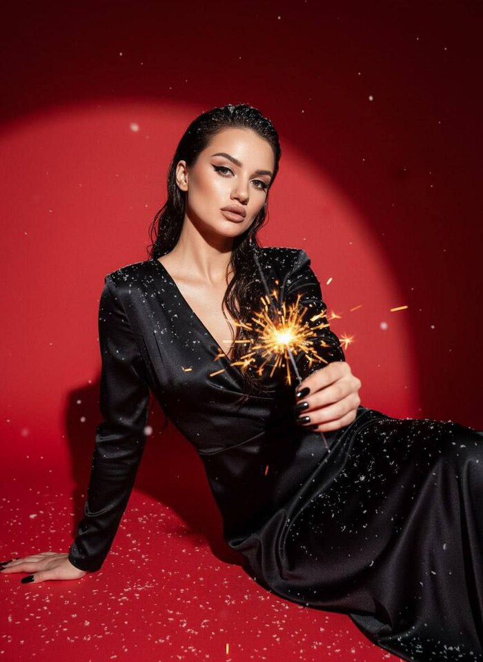 Гиперреалистичное фото Девушка сидит в атласном чёрном платье с рукавами сидит оперевшись на одну руку, на ярко красной циклораме в студии, идёт снег, снег на голове плечах. Волосы длинные уложены блестящим гелем назад, часть волос, пряди выбиваются. Кадр с низкого угла Она протягивает в камеру бенгальский огонь, он крупно в кадре Губы матовые нюдовые стрелки черные на глазах, ресницы густо прокрашены черным Маникюр чёрный квадрат короткий Кожа девушки в хайлайтере Фото со вспышкой вокруг темно Студийная фотосессия Стиль Vogue