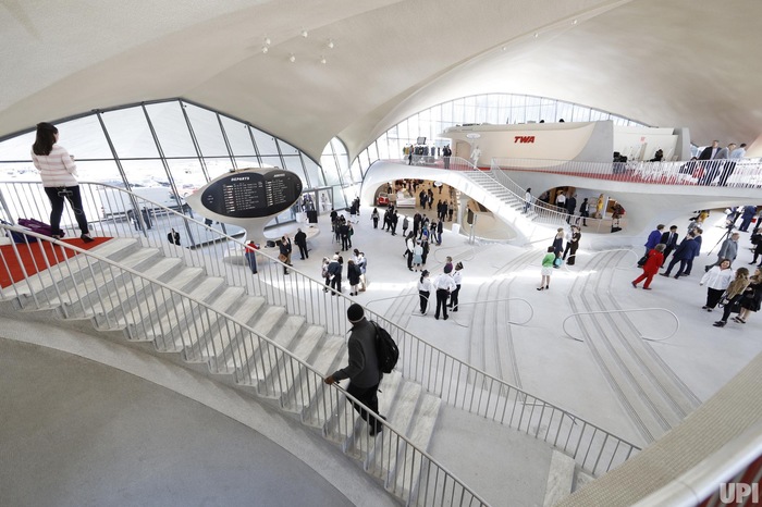 Отель TWA в международном аэропорту Нью Йорка им. Джона Ф. Кеннеди открылся в эту среду и пригласил гостей ощутить славное прошлое - золотую эру авиационных путешествий середины XX века.