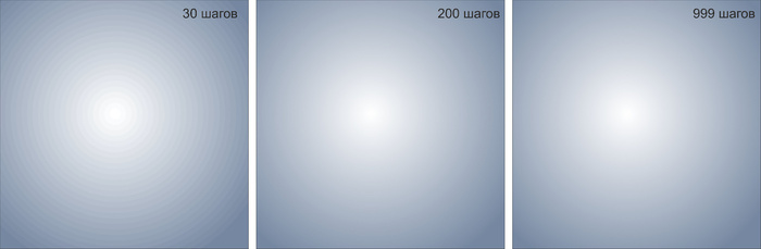 Тут немного сложнее. На больших макетах и 999 шагов может не хватить для плавного перехода. Всё таки градиенты больше растровая тема, поэтому, по возможности, растрируем со сглаживанием.