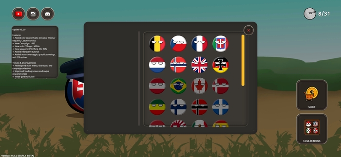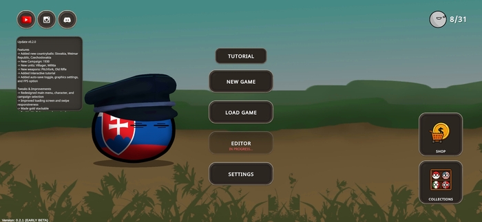 Это главное меню игры (разработчики обещают добавить русский язык в будующем) в котором есть настройки, коллекция стран, туториал и прочие кнопки