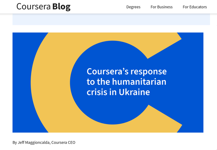 We are halting further business with Russian institutions across Coursera for Business, Coursera for Government, and Coursera for Campus.