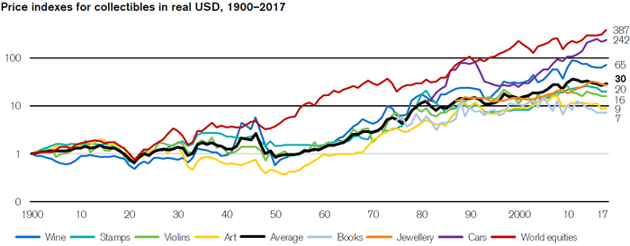 С 1900 года средняя стоимость предметов коллекционирования имела среднегодовой реальный рост цен 2,9%. Из 4 предметов коллекционирования, по которым имеются данные с 1900 года, лучшие показатели – у вина (рост цен в годовом выражении с учетом инфляции составил 3,7%), в то время как у объектов искусства – всего 1,9% в год. Как говорится In vino veritas, in aqua sanitas.