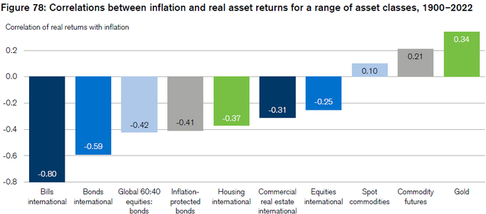 Но нас интересует именно золото. Почему? Потому что оно имеет самую высокую корреляцию с инфляцией. Рост инфляции - рост цены на золото. Это важный элемент пассивного портфеля (хоть его доля и должна быть невелика), так как в хороший портфель состоит из нескоррелированных инструментов.