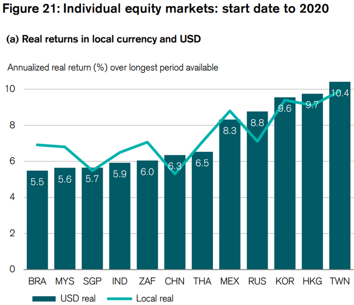 Россия показала крайне интересую динамику акций с 1995 до 2020. Она оказалась лучше на 2.7% чем в развитых рынках, с учётом инфляции. А именно, 8.8% реальной доходности.