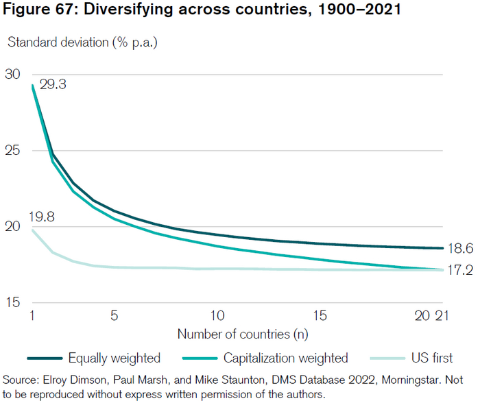 В перспективе рекомендация всем инвесторам инвестировать глобально. Это снизит риск портфеля и повысит коэффициент Шарпа (прибыль делёная на риск). Однако в сколько стран нужно инвестировать, чтобы достичь оптимальных коэффициентов?