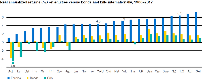 Из всех активов, акции показали самые лучшие результаты в долгосрочной перспективе. За последние 120 лет глобальные акции приносили годовой реальный доход в долларах США в размере 5,3% по сравнению с 2,0% для облигаций и 0,7% для векселей.