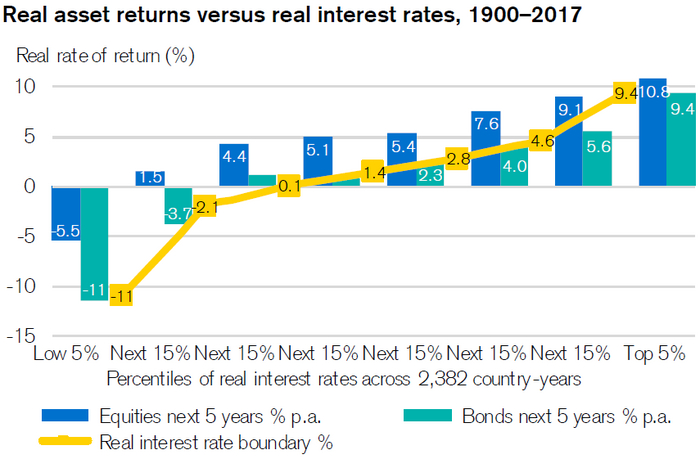 Влияние РБС (жёлтая), на реальную доходность акций (синяя) и облигаций (зелёная) в последующие 5 лет.