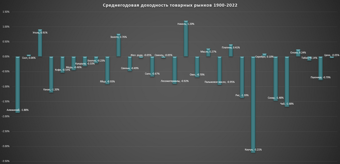 Как известно, товарные рынки практически не приносят доходности инвестору. И исследование с 1900 года это подтверждает.